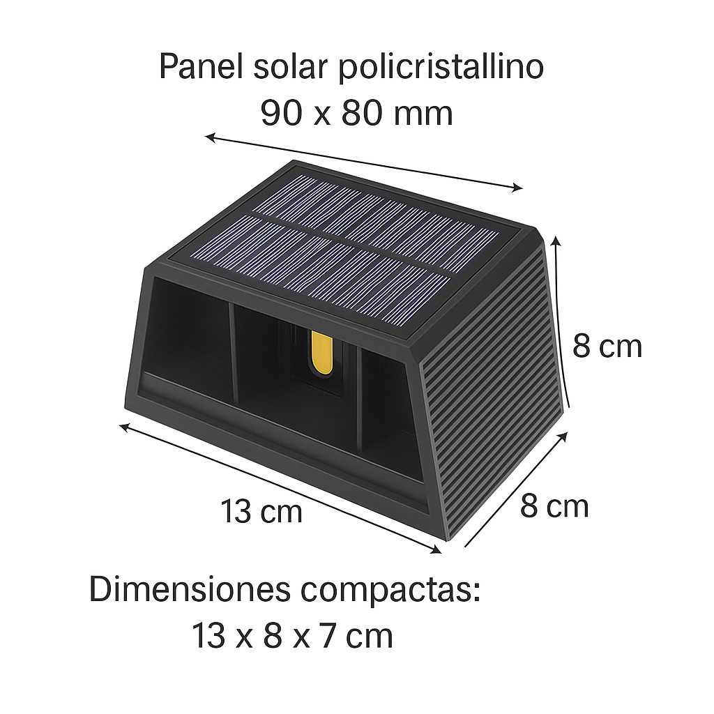 Dimensiones compactas: 13 × 8 × 7 cm.